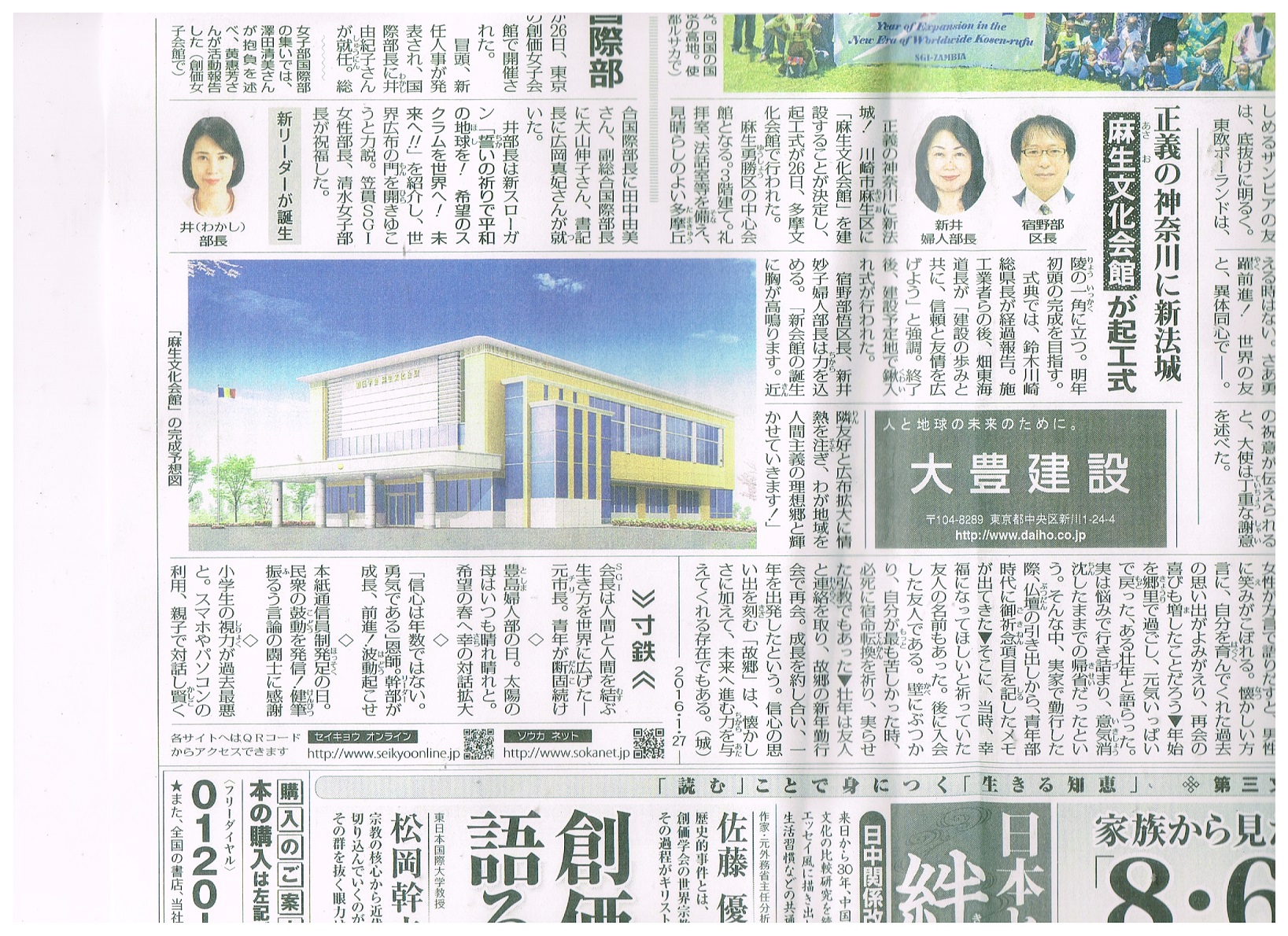 麻生文化会館の起工式を伝えた聖教新聞 平成28年(2016年)1月27日第一面